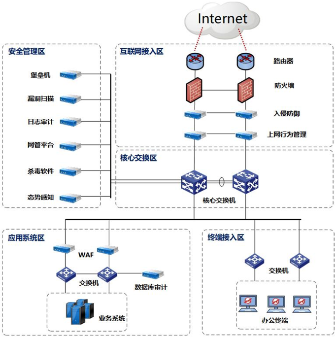 3、安全管理区:部署堡垒机、漏洞扫描、日志审计、网管平台、杀毒软件、态势感知等