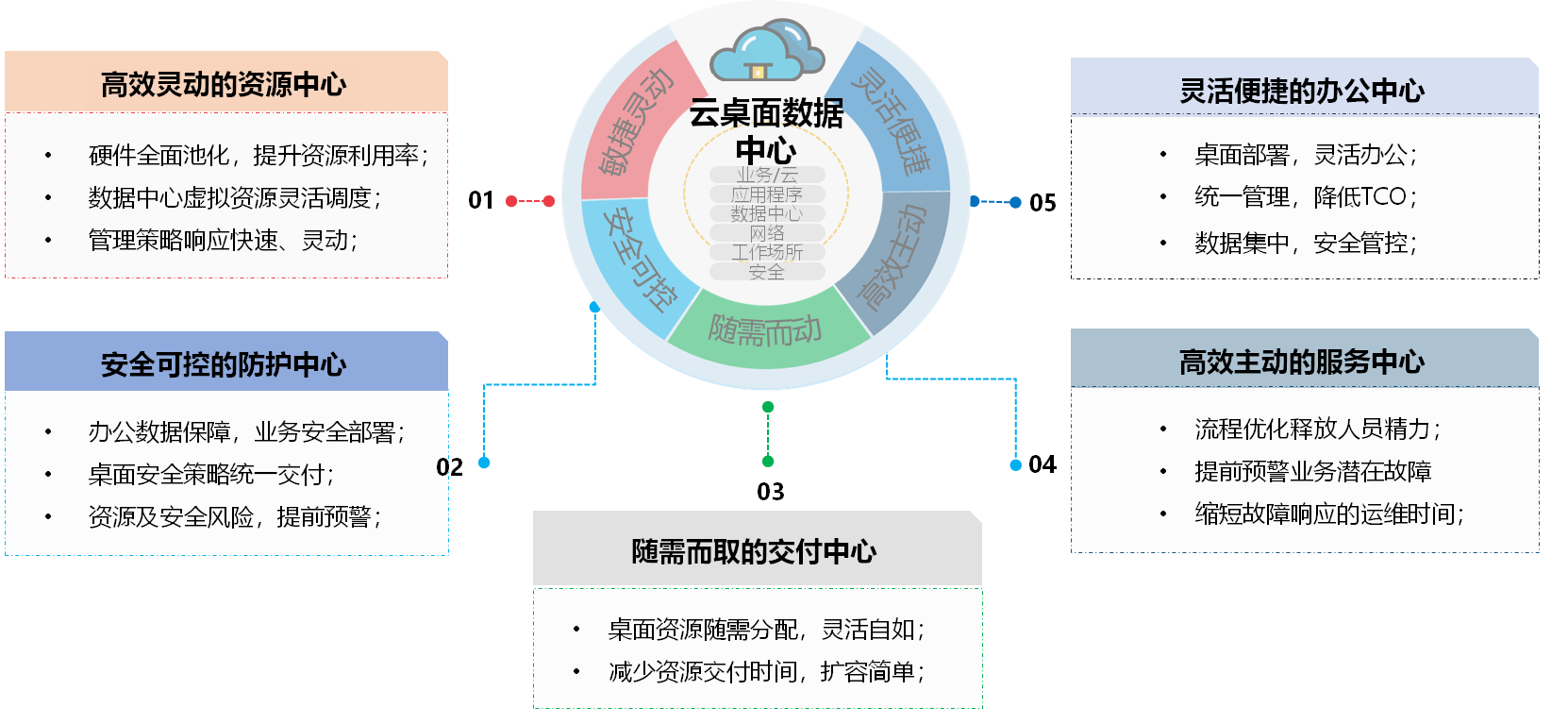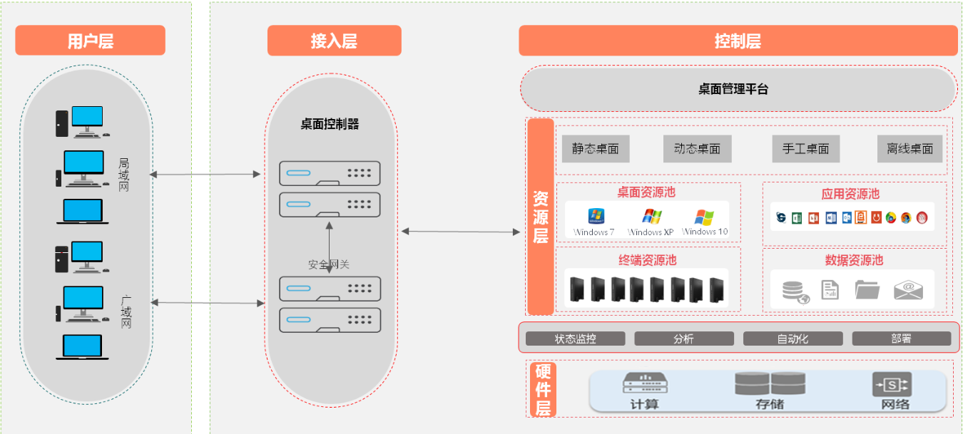 作为一种云计算架构,将操作系统、数据和终端全部集中到数据中心进行管理。用户可以针对不同的业务场景,灵活配置。以最出色的性能、安全性,极低成本的交付Windows桌面,满足各种业务的需要。
